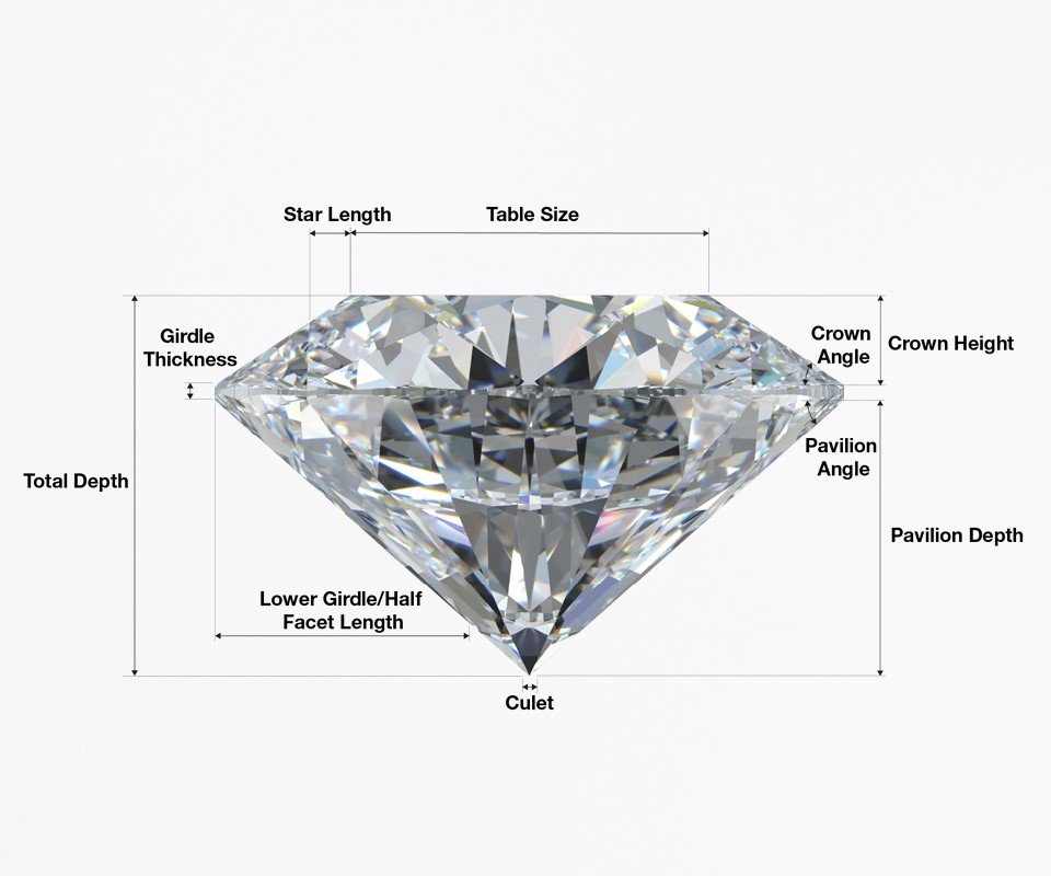 The cut of a diamond is a question of craftsmanship. When you hear words like Brightness, Scintillation and Fire, they describe how masterfully a diamond is cut. A diamond’s cut refers to how it interacts with light. While a term like oval would refer to the shape, or outline of a diamond, cut also describes the overall design of a diamond, including the arrangement and proportions of the diamond’s facets. Diamond cut grades are only given to round brilliant cut diamonds because they are the only cut that have standardized facets. All other shapes are referred to as fancy shapes, which includes marquise, emerald, pear, oval, hearts and even triangles. Proportions impact the face-up appearance, allure and attractiveness of diamonds. There are many components to consider when assessing the overall cut quality of a round brilliant diamond, one of which is the individual’s preference. Each grade range represents a range of proportion sets, so there is plenty of room for personal preference within a preferred grade range. There is a nearly unlimited combination of proportions possible, and all of them impact the interaction with light, and ultimately how attractive the diamond appears.